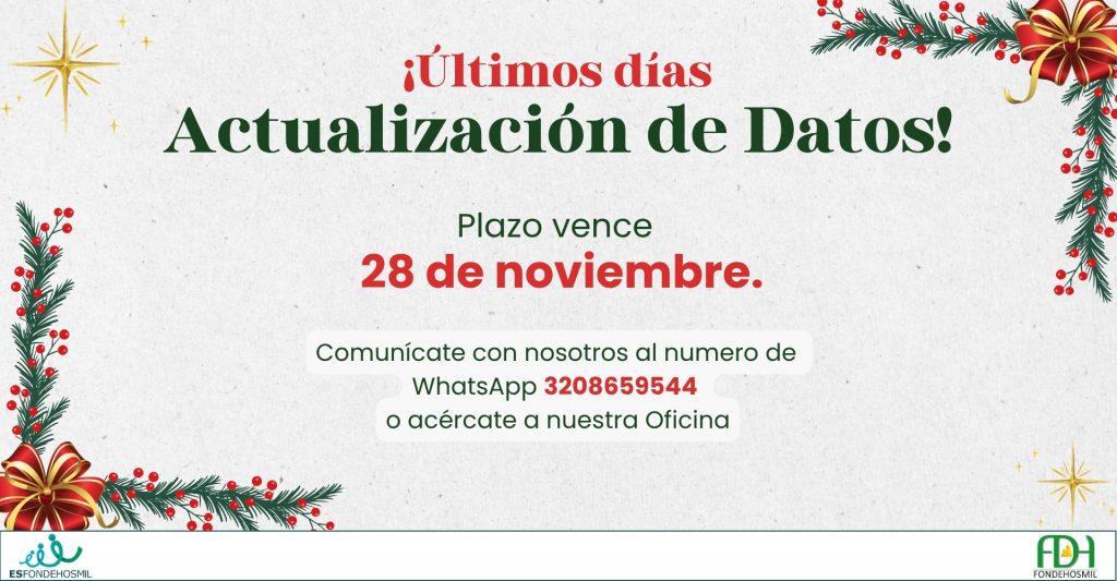 11 Nov Servicios ÚLTIMOS DÍAS ACTUALIZACIÓN DE DATOS 11 noviembre, 2025 By Fondehosmil 0 comments Facebook Twitter Pinterest linkedin Telegram ¡ACTUALIZA TUS DATOS 2025! Estimados asociados: Le...Leer más...